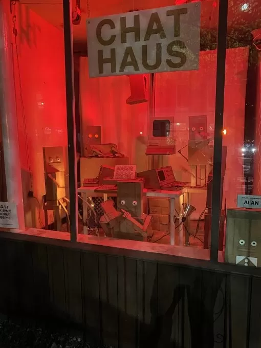 This isn't your typical shared workspace. Chat Haus hosts AI chatbots exclusively, with even its human counterparts crafted entirely from cardboard.